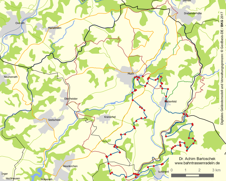 Ursprüngliche Bewertung: Die "Mountainbiketour" ist ein 35 km langer Rundweg südöstlich von Much. Die Strecke ist nur in eine Richtung gegen den Uhrzeigersinn ausgewiesen und wird nur zu einem kleinen Teil durch das HBR-Netz mit Einschüben in Zielwegweiser abgedeckt. Der Rest der Route ist mit kleineren Altwegweisern beschildert; an einigen Stellen gibt es auch unerwünschte Doppelbeschilderungen zur HBR-Wegweisung. Die Mucher Rundtouren wurden im Mai 2007 im Rahmen des "1. Mucher Fahrradtags" eröffnet.