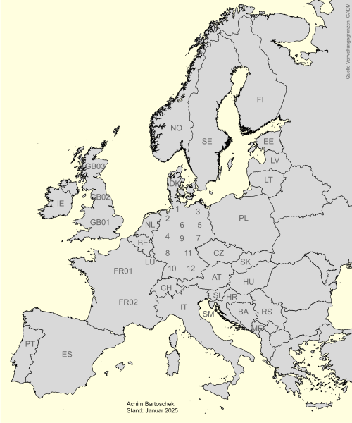 Die folgende Übersichtskarte erschließt die meist länderbezogenen Kartenblätter, die für Deutschland, Großbritannien und Frankreich weiter unterteilt wurden. Aus Gründen der Übersichtlichkeit sind nur die beschriebenen Radrouten und ausgewählte geplante Bahntrassenwege eingezeichnet, auf die Kennzeichnung nicht ausgebauter Bahntrassenabschnitte im Zuge bestehender Radwege wurde verzichtet. Die unmittelbar auf den alten Bahnkörpern angelegten Abschnitte sind nicht besonders hervorgehoben. Beachten Sie daher bitte, dass die eingezeichneten Routen zum Teil längere Stücke enthalten, die auf konventionellen Radwegen und als Lückenschlüsse auch auf Straßen verlaufen. Soweit vorhanden, lassen sich die Tunnel, die im Zuge von Bahntrassenwegen durchfahren werden können oder bei denen eine solche Nutzung geplant ist, mit einem Auswahlelementen unterhalb der Karten einblenden.