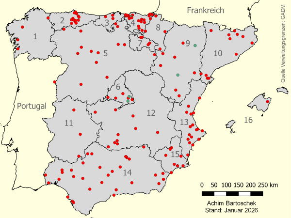 Übersichtskarte: Radwege auf stillgelegten Eisenbahnstrecken in Spanien (Klicken Sie auf die farbigen Punkte, um zu den Detailinformationen zu gelangen.)