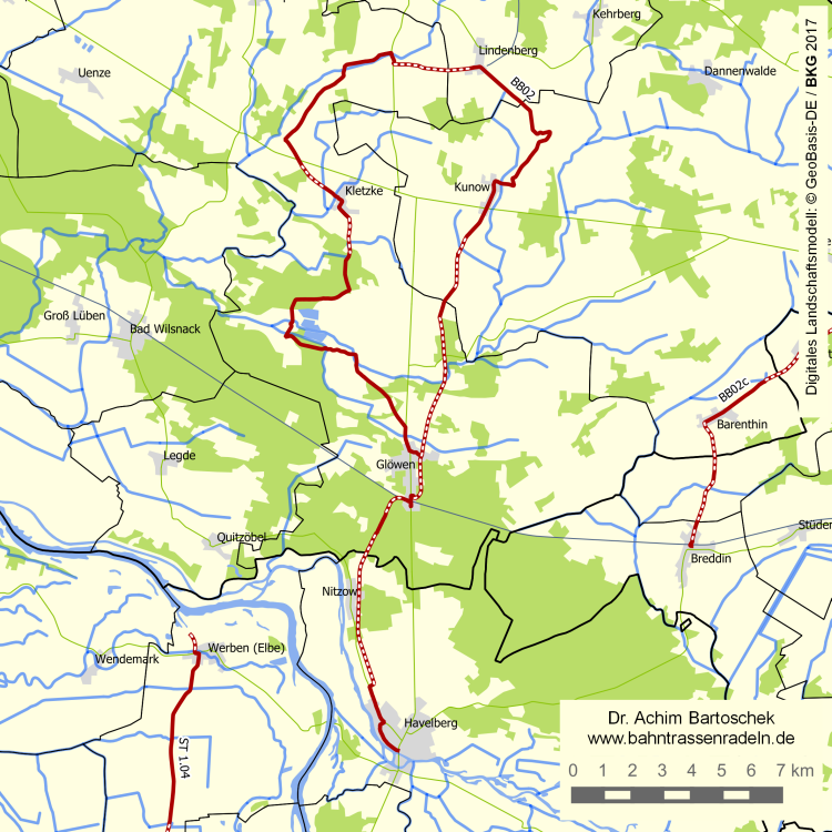 ... der in der Nähe des Bf Glöwen an der Bahnstrecke Berlin –; Wittenberge endet.