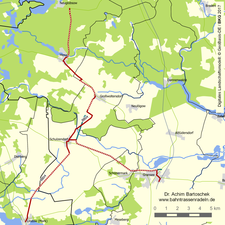 Kleinbahn Gransee-Neuglobsow / Gransee – Schulzendorf – Neuglobsow; 23 km (1435 mm) Es gab auch eine Strecke Lindow – Schulzendorf, die teilw. als Wirtschaftsweg befahrbar sein könnte. |
