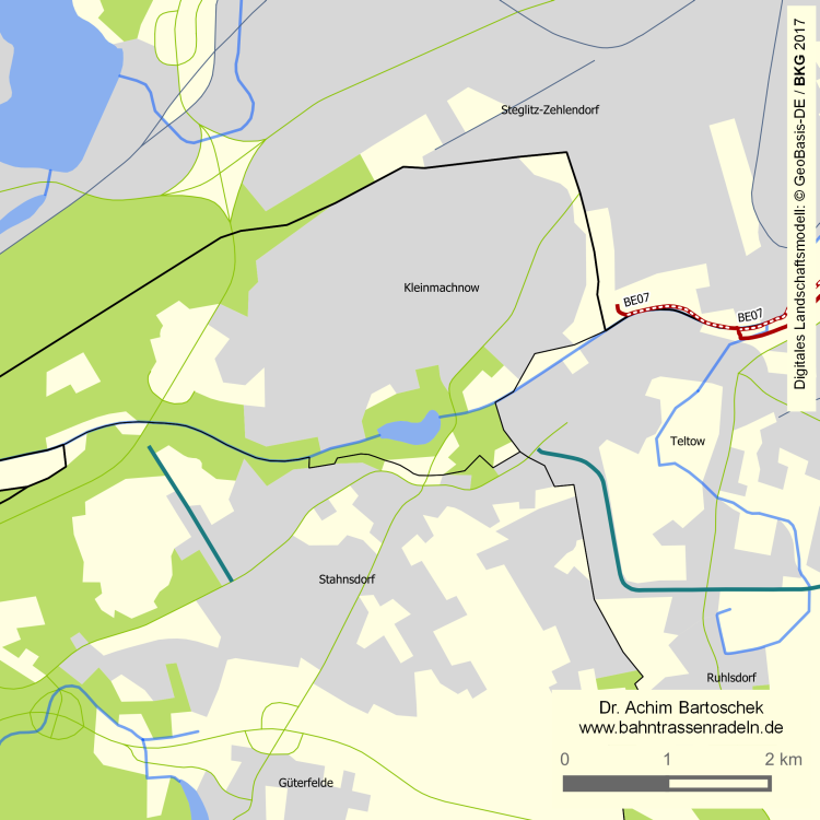 Planungen: | Der erneute Anlauf zu einem Radweg auf der Freihaltetrasse für eine schon lange geplante, aber bisher nicht realisierte S-Bahn von Berlin-Wannsee nach Stahnsdorf ("Friedhofsbahn") scheint diesmal insbesondere in Stahnsdorf auf ein durchaus positives Echo zu stoßen. Die Deutsche Bahn will die Strecke verkaufen, die Kommunen wollen die Flächen für eine mögliche spätere erneute Bahnnutzung zu sichern. [Februar 2016] |