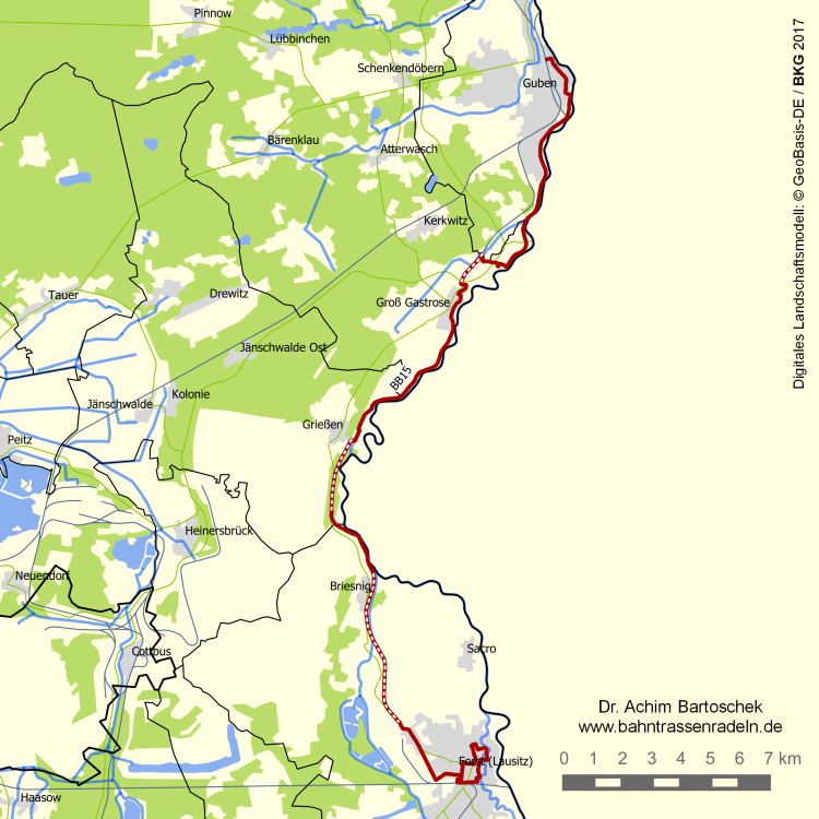 Gesamtlänge: vom Bf Guben zum Bf Forst, weitere 1,2 km der Trasse sind als Feldweg befahrbar |