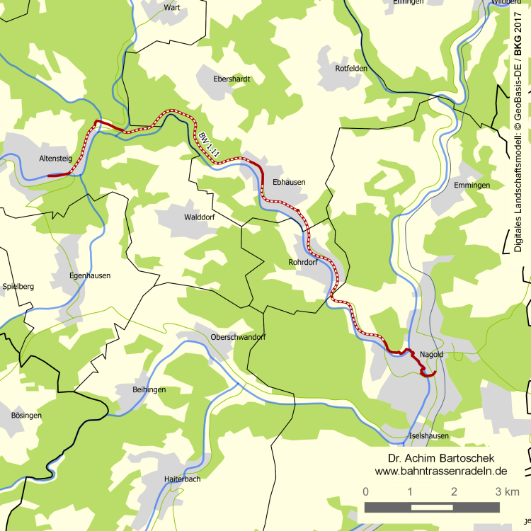 kontinuierliche l. St. von Nagold (400 m ü. NN) nach Altensteig (440 m) |