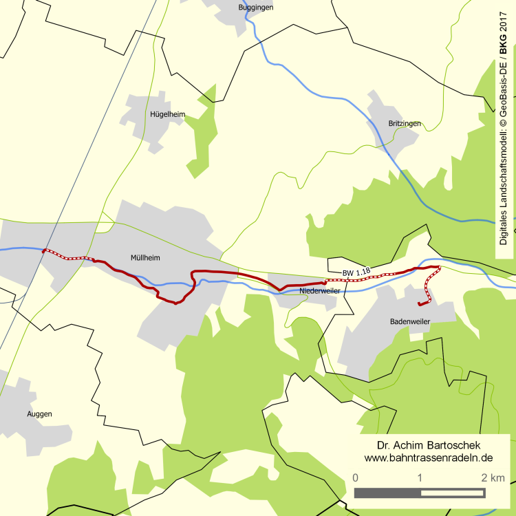 Die Schmalspurbahn hinauf nach Badenweiler verlief in den Ortsdurchfahrten ohne eigene Trasse im Straßenraum. Der schönste separat geführte Abschnitt zwischen Oberweiler und Badenweiler ist allerdings leider nur als Wirtschaftsweg erhalten und nicht Teil des Radroutennetzes. |