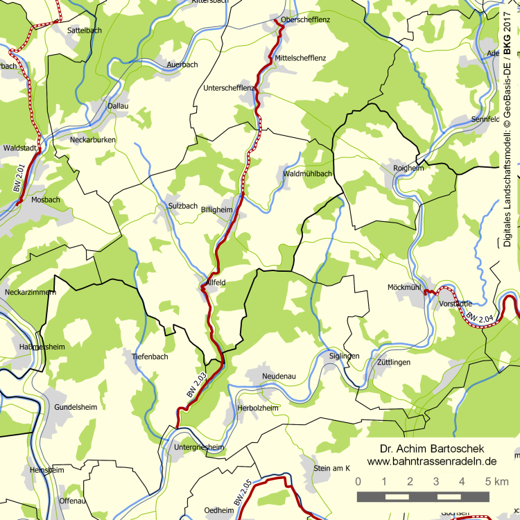 nach der Überquerung eines kleinen Seitenbaches Ende des R/F (Pfostensperre) schräg links: parallel zum ehem. Bahndamm; in UNTERSCHEFFLENZ Karchgässlein, diesem schräg links und am Zugang zur Brücke geradeaus folgen |