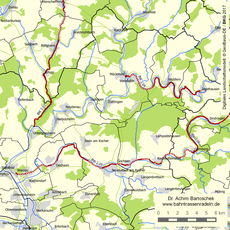 an der Brücke / ehem. Bf Kochertürn die L 720 wenig rechts versetzt queren (ein Drängelgitter): asph. Weg unterhalb der Trasse, später Linkskurve und St. |