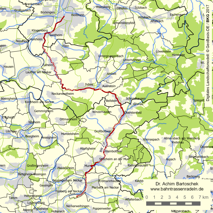 langgez. l. St. von Heilbronn (Hbf: 160 m ü. NN) nach Beilstein (270 m), dann langgez. l. Gef. zum Neckar (200 m); Bf Marbach auf 220 m |