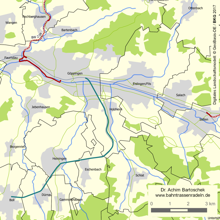 | Planungen: | Nachdem 2009 ein erster Vorstoß zur Nutzung der Stichbahn von Göppingen nach Bad Boll als Radweg ergebnislos verlief war die Diskussion im Sommer 2014 ohne greifbare Ergebnisse erneut aufgelebt. Anfang 2018 sollte die Strecke als Zubringerroute eines geplanten Radschnellwegs durch das Filstal als Zwischennutzung betrachtet werden. Auf der anderen Seite gibt es, bisher ebenfalls ohne greifbare Resultate, immer wieder Überlegungen zu einer Reaktivierung inkl. eines Lückenschlusses zwischen Bad Boll und Weilheim an der Teck. [Januar 2018] |