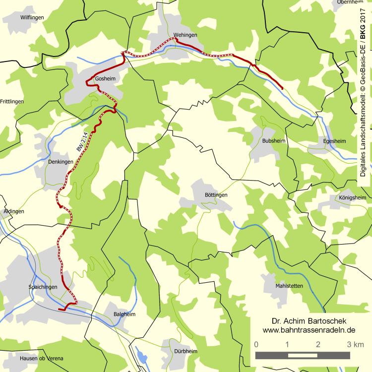 in der Näherung langgez. fl. Kuppe von Spaichingen (670 m ü. NN) über Gosheim (850 m) nach Reichenbach (750 m); durch die Umfahrung verfüllter Einschnitte und nicht ausgebauter bzw. zerstörter Brücken einige kurze, z. T. heftige Steigungen |
