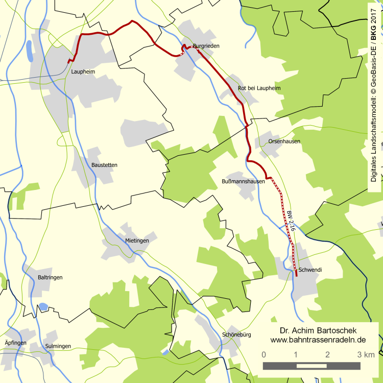 Bahntrassenabschnitte: in Burgrieden ca. 0,2 km und zw. Höhe Bußmannshausen und Schwendi ca. 2,6 km |