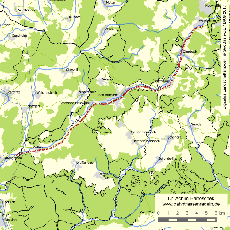 Status / Beschilderung: | Bahntrassenweg als kombinierter Fuß-/Radweg; Radwegweisung, in Bayern mit dem Logo Rhönexpress-Radweg; ein kurzes Stück am westlichen Ende ist auch Teil des hessischen Radfernwegs R 2 |