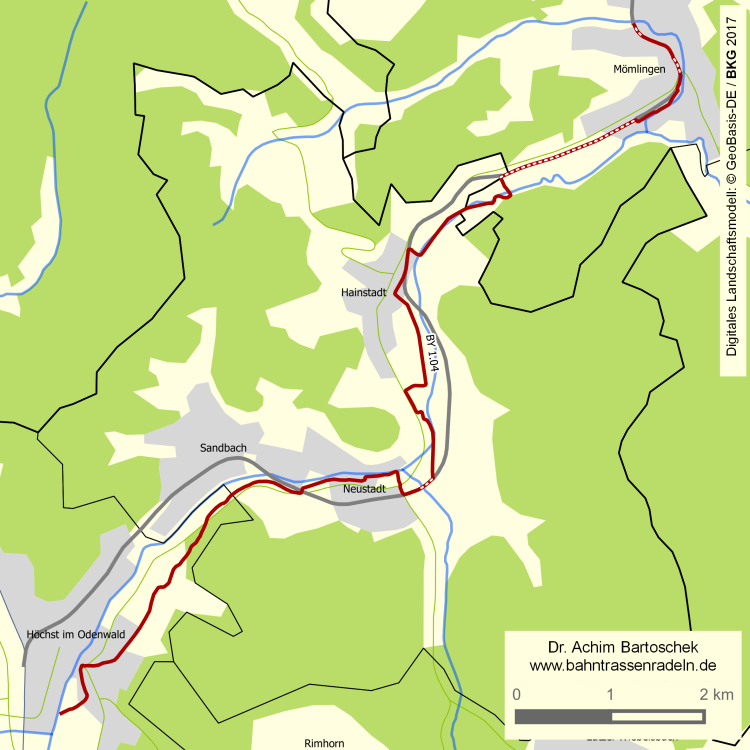 im Ortsbereich Mömlingen; am Sportplatz sind weitere 400 m befahrbar und auch der anschließende 1,2 km lange Feldweg scheint der Bahn zu folgen; bei Neustadt im Odenwald (Hessen) sind etwa 200 m ausgebaut. |