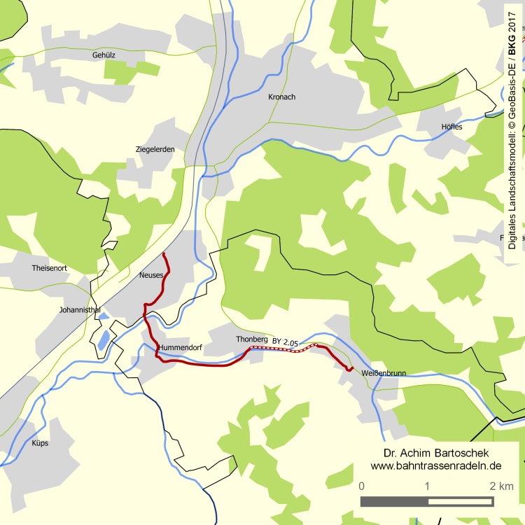 inkl. Anbindung von Bf Neuses; bei Hummendorf wurde der Bahndamm im Sommer 2014 inkl. der Brücke über die Rodach abgerissen (Hochwasserschutz) |