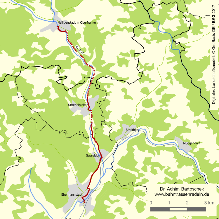 Von der in der Fränkischen Schweiz gelegenen Stichbahn von Gasseldorf ins Leinleitertal wurde etwas über die Hälfte als Radweg und somit als steigungsarmer Zugang nach Heiligenstadt ausgebaut. |
