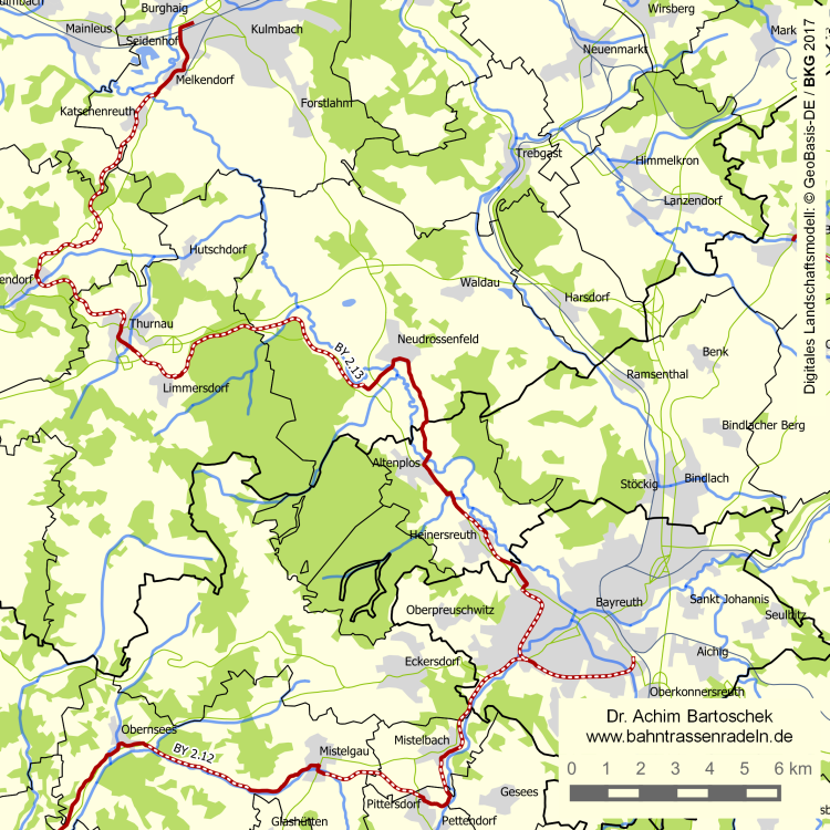 Bayreuth – Heinersreuth – Altenplos – Neudrossenfeld – Neuenreuth a. Main – Limmersdorf – Thurnau – Kasendorf – Krumme Fohre – Proß – Katschenreuth – Kulmbach-Melkendorf |