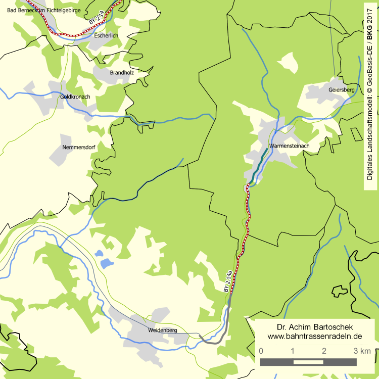 Radwegebau: | Nach der Ausschreibung der Bahnstrecke Mengersreuth – Warmensteinach zum Verkauf wurden alternative Nutzungskonzepte erstellt. Rund die Hälfte dieses nicht mehr genutzten Stücks soll zu einem Radweg ausgebaut werden. Mit Baubeginn im Mai 2018 wurde der 3,7 km lange Abschnitt von Sophiental bis zum Bauhof Warmensteinach realisiert und ist seit dem 15. November befahrbar. Südlich von Sofiental wurde der Iskaraweg nach Waizenreuth befestigt, sodass zur Anbindung nach Weidenberg das Trassenstück ab Mengersreuth ungenutzt bleibt. Mit Beginn der Arbeiten im August 2019 folgte in einem zweiten Schritt die innerörtliche Anbindung zum ehem. Bahnhof Warmensteinach |