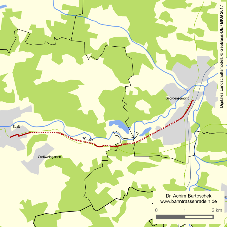 Die alte Bahntrasse von Georgensgmünd nach Spalt bleibt im Tal der Fränkischen Rezat und kann zur (dann allerdings hügligen) Anfahrt zum Brombachsee genutzt werden. |