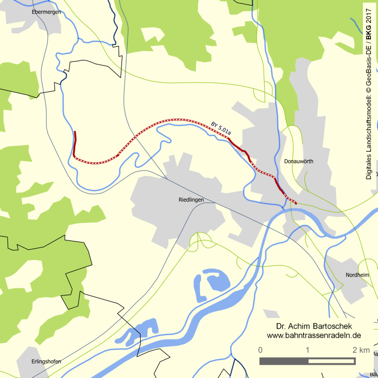 mit k. Gef. rechts versetzt von der Trasse (der Damm ist auf rund 500 m abgetragen); ab dem Ende des R/F am Ortsanfang DONAUWÖRTH (Wasserwerk) asph.; hinter dem Sportplatz schräg rechts |