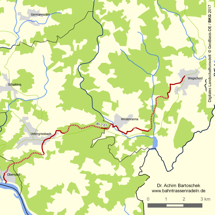 langgez. St. von Obernzell (290 m ü. NN) nach Untergriesbach (540 m), l. hügelig bis hinter Wildenranna und langgez. St. nach Wegscheid (710 m); Steigung auf den beiden Zahnradabschnitten: max. 7 % |