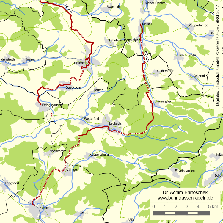 Streckenlänge (einfach): | ca. 26,5 km (davon ca. 18,3 km auf der ehem. Bahntrasse) zwischen Hungen und dem Laubacher Wald weitestgehend auf der ehem. Bahntrasse und ca. 4 km zwischen Mücke und Stockhausen (davon ca. 1,9 km auf der Trasse, z. T. als straßenbegleitender Radweg zur B 276) |