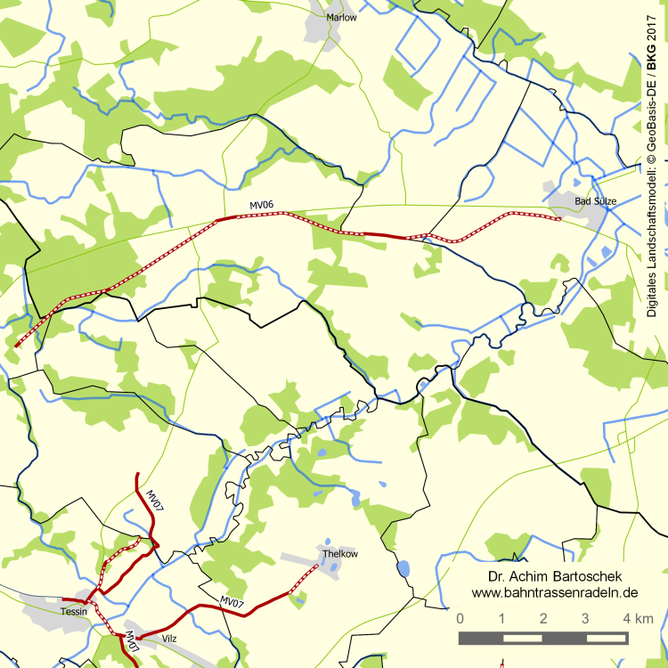 Beginn des wg. Bahntrassen-R/F am ehem. Bf BAD SÜLZE (an der L 19; vom Ortszentrum über die Rosa-Luxemburg-Straße zu erreichen: anfangs schmale Fahrspur; min. St., ein Querweg; flacher Einschnitt und Damm |