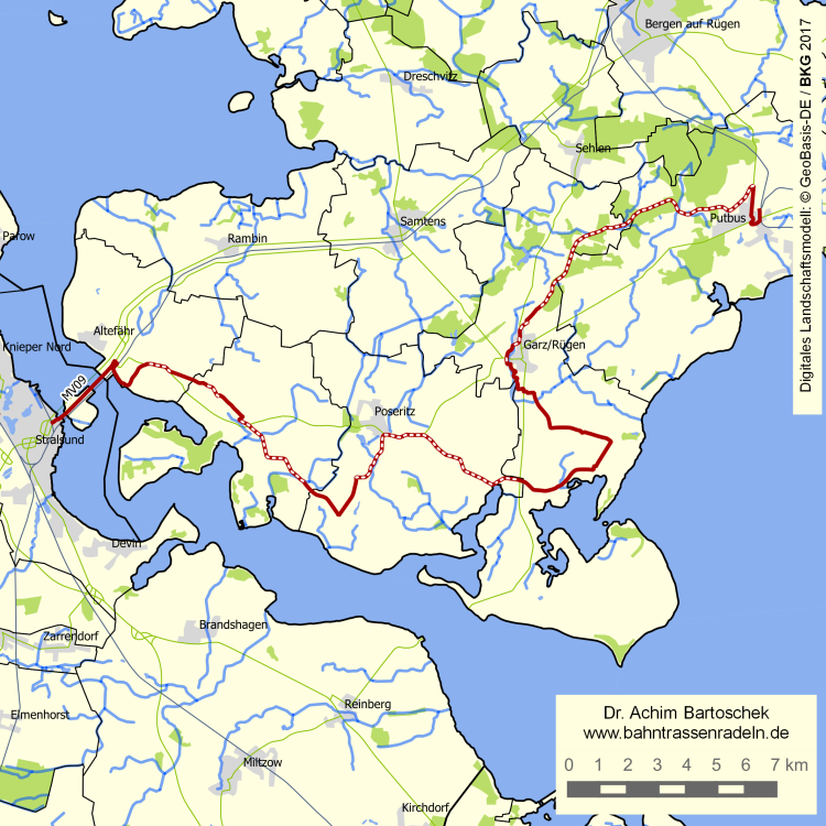 6982 (Rügensche Kleinbahn) / Altefähr – Putbus – Göhren; 60 km (750 mm); Abschnitt Altefähr – Putbus: 35 km |