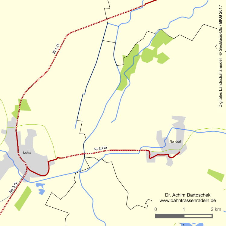 Planungen: | Auch beim Anfang Juli 2014 begonnenen Bau des straßenbegleitenden Radwegs von Nendorf nach Stolzenau dürfte zum Teil auf die frühere Kleinbahntrasse zurückgegriffen werden. [Juli 2014] |