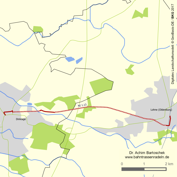 an der Kreuzung rechts: Dinklager Ring (rechter asph. Zweirichtungs-R/F), die Straße verläuft dann im Zuge der ehem. Bahntrasse |