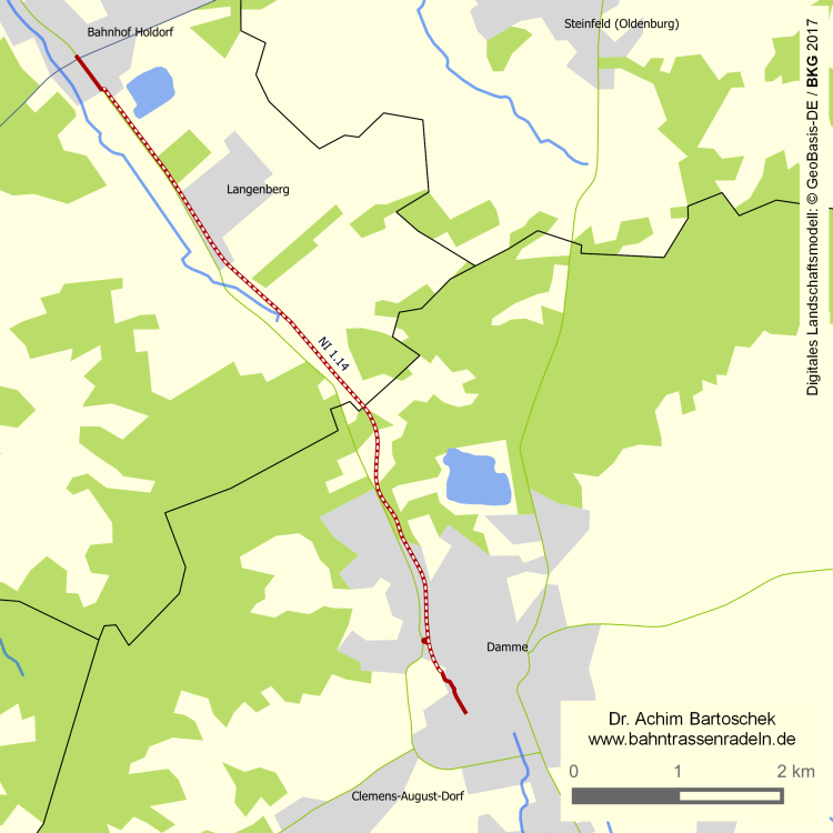 vom Bf Holdorf (heute nur noch Hp) an der Straße links und die Bahnstrecke Delmenhorst Hesepe queren: Dammer Straße / L 851 (rechter Zweirichtungs-R/F) |