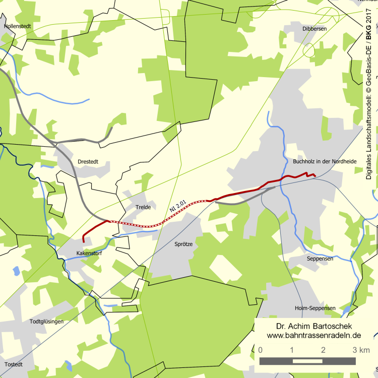 Bisher sind nur 3 km der Bahnstrecke von Harsefeld nach Buchholz mit zwei größeren Dämmen ausgebaut. Von der anschließenden Trasse ist bis Hollenstedt viel verschwunden.