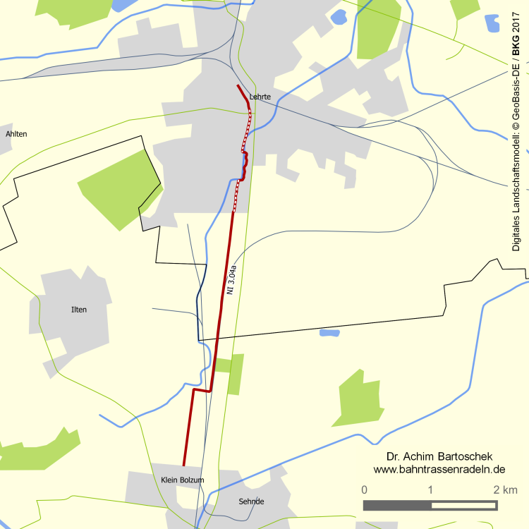 2,2 am südlichen Ortsrand von Lehrte rechts versetzt (Pfostensperre): asph. Wirtschaftsweg parallel zur ehem. Trasse