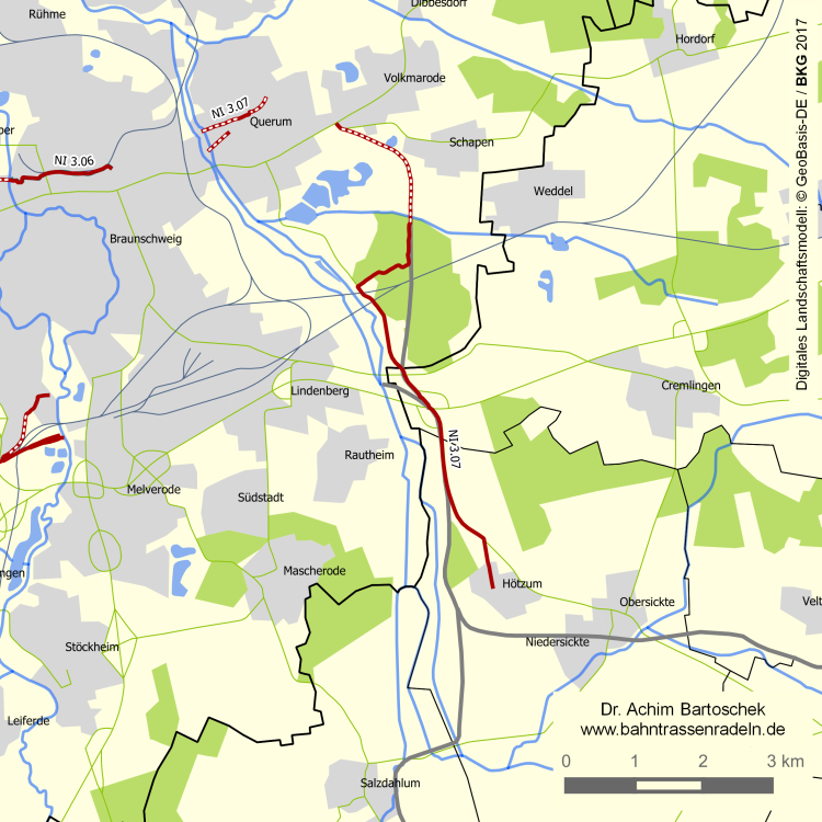 bei 2,8 die BAB 39 unterqueren: Schöppenstedter Turm / L 625 (linker R/F); am ehem. Bahnhof Rautheim vorbei |