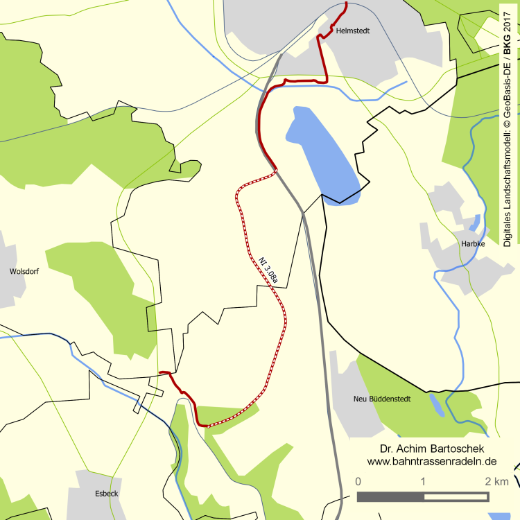 ab der Bahnbrücke / Linkskurve nicht mehr auf der Trasse; bei 6,4 geradeaus oberhalb des Lappwaldsees entlang; später l. St. |