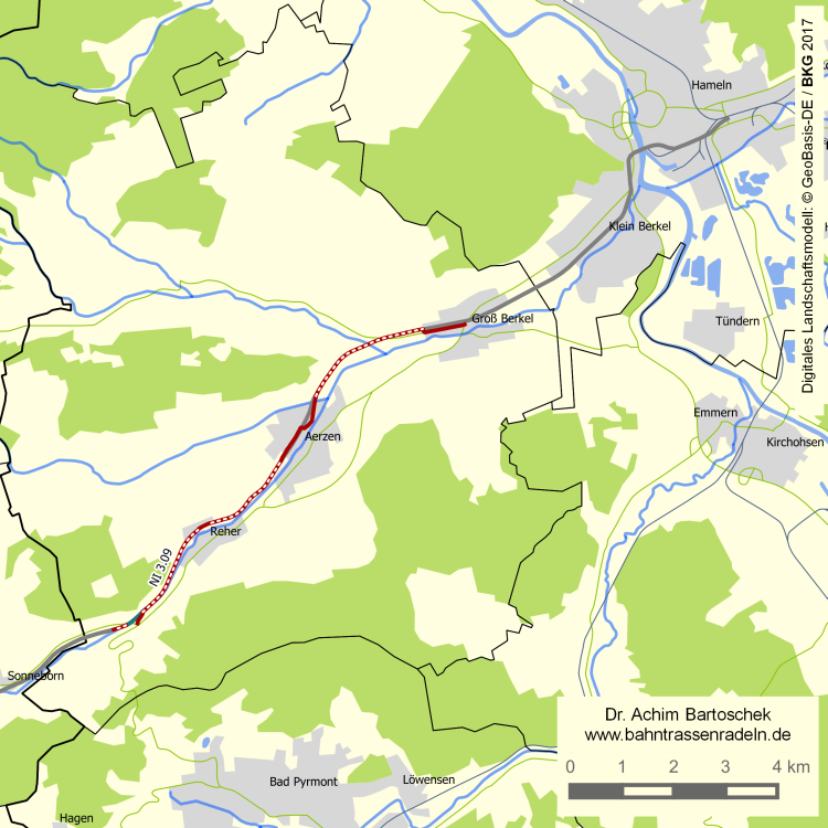 freigeg. F, auf dem neueren Abschnitt bis auf die Endstücke kombinierter Fuß-/Radweg; Radwegweisung nur zwischen Aerzen und Groß Berkel; der Weg ist Teil des künftigen Weser-Elbe-Weges (Radfernweg 12 des N-Netzes), als solcher aber noch nicht beschildert |