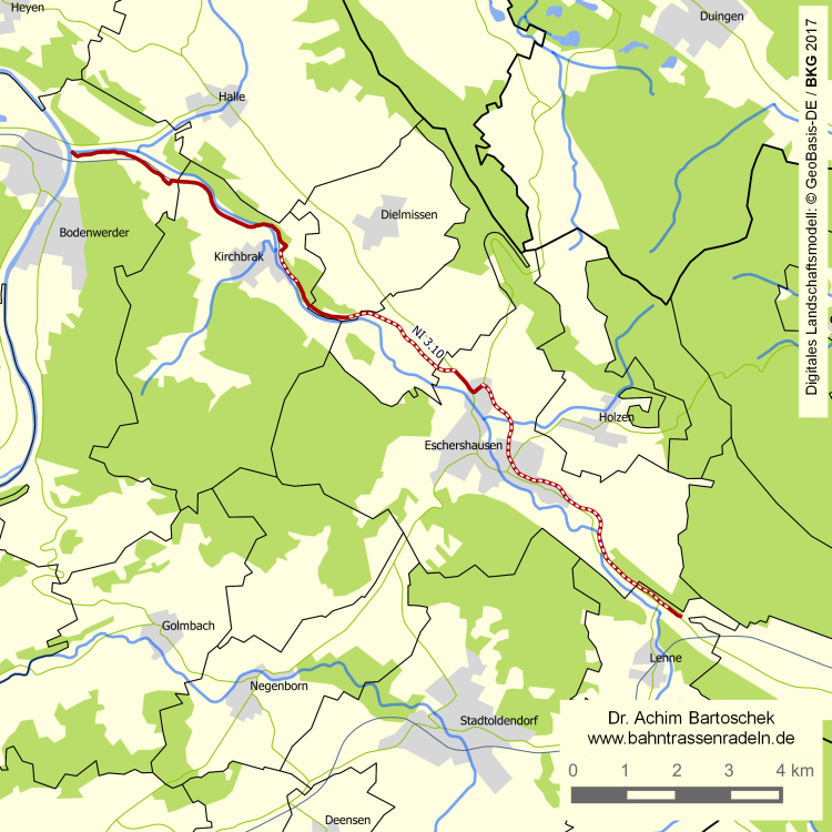 keine StVO-Beschilderung; Wegweisung als Lenne-Freizeitweg Zwischen Buchhagen und dem Zementwerk Dielmissen (gegenüber Osterbrak) wurde die Bahnstrecke auch für einen Draisinenverkehr genutzt. Der Freizeitweg verläuft teilweise unmittelbar neben der Bahn, zum Teil aber auch zwischen den Gleisen (Schiebestrecken). |