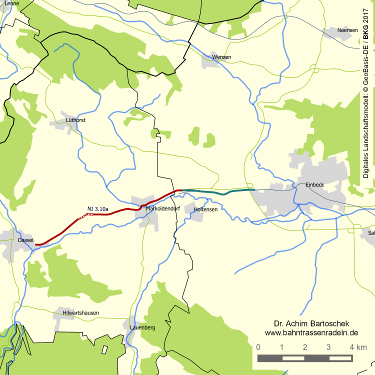 Während der straßenbegleitende Radweg von Juliusmühle bis Dassel überwiegend auf der jeweils anderen Straßenseite als die frühere Bahn angelegt wurde, ist in Eilensen ein kurzer innerörtlicher Bahntrassenweg entstanden. Mehr geplant ist zwischen Einbeck und Juliusmühle. |
