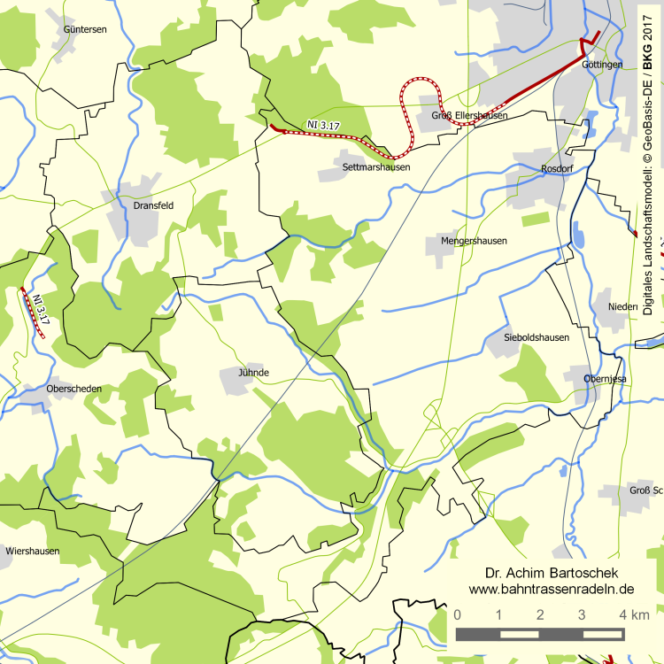 Teile der Trasse zw. Dransfeld und Wellersen sind Ausgleichsflächen für die ICE-Neubaustrecke und standen für einen Radweg nicht mehr zur Verfügung. Hier wurde seit dem 17. Juli 2017 bis Oktober 2017 auf 3,1 km ein Weg entlang (südlich) der Bundesstraße gebaut. |