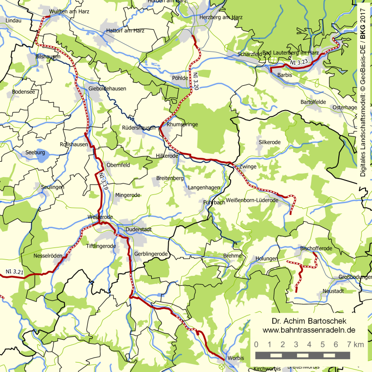 Mit dem Radweg von Wulften nach Gieboldehausen ist 2005/07 eine gut zu fahrende Verbindung zwischen diesen Orten mit schönen Bahnbrücken entstanden, von denen aber inzwischen eine nur noch schiebend benutzt werden darf. Eine Fortführung nach Rollshausen schien zwischenzeitlich zu versanden, dieser Abschnitt wurde erst 2014 fertiggestellt. In Thüringen wurden ebenfalls Abschnitte der Bahnstrecke zum Radweg ausgebaut. |