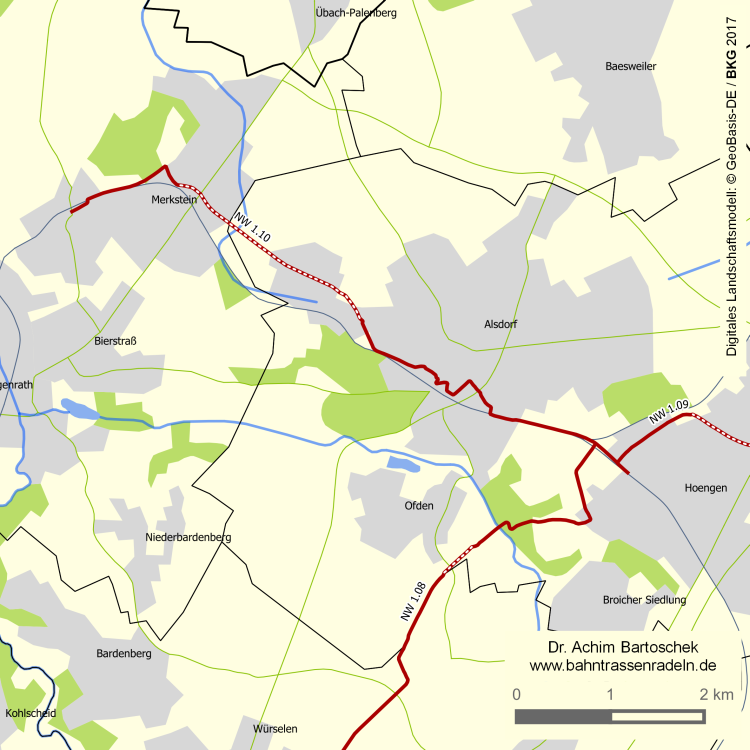 - OM: 1991 07 00, "Rad-/Gehweg alte Grubentrasse von Alsdorf-Busch bis Herzogenrath-Merkstein", 1.660 m, Baubeginn: 1992