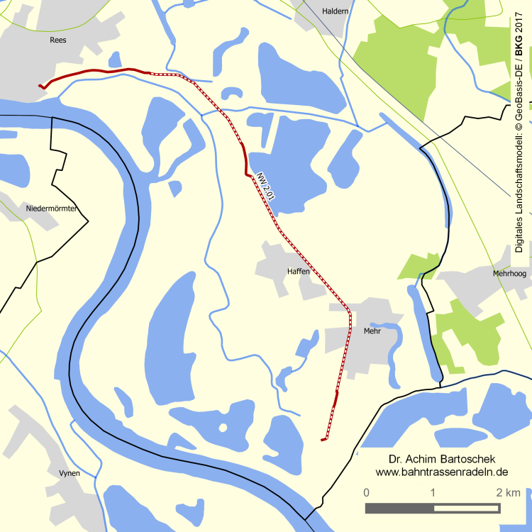 Die Trasse verlief ohne noch erkennbare Spuren etwa im Bereich des Deichverteidigungsweges. Am Parkplatz links zweigte die Strecke nach Empel ab.