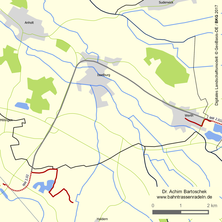 auf der Reeser Straße links versetzt die Eisenbahn queren; eine Straße unterqueren, die Straße im Verlauf der ehem. Bahntrasse biegt nach links von der Bahn weg |