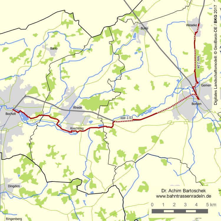 zwischen Hoxfeld und Borken inzwischen durchgehend asph. (Breite 2,5 m); der neuere Abschnitt bei Rhedebrügge ist wassergebunden |