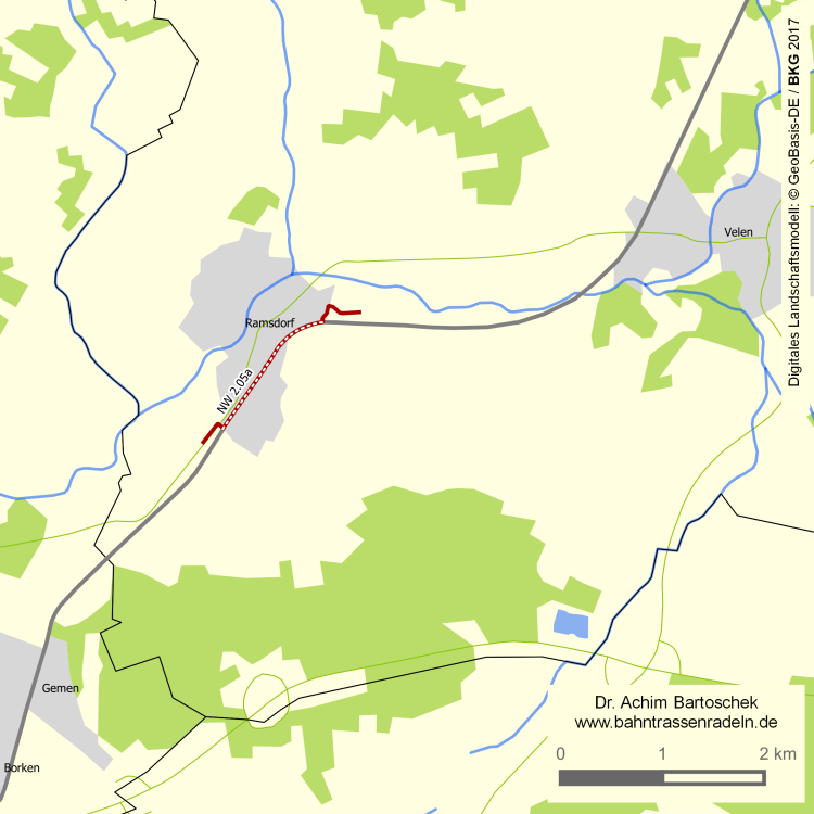Route: | Ortsgrenze Ramsdorf bis zur Heidener Straße; in Velen wurde ein neuer Radweg neben der teilw. überbauten Bahntrasse angelegt |