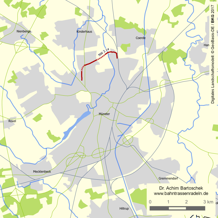 am Ende des R/F wenig rechts versetzt durch die Pfostensperre: Meßkamp parallel zur Trasse; an den Kreuzungen Salzmannstraße und Kinderhauser Straße geradeaus folgen |