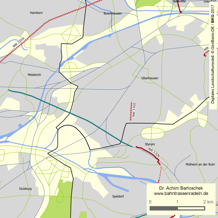 Planungen: | Im mittelfristigen Investitionsprogramm des RVR für das regionale Radwegenetz ist der Styrumer Pfad für 2017 vorgesehen unter dem Vorbehalt, dass die Stadt Duisburg eine Verbindung zum Grünen Pfad (NW 3.01b) herstellt. Bei den aktuellen Betrachtungen der Radinfrastruktur im Umfeld des Radschnellweg Ruhr wird dieses Projekt allerdings als langfristiger eingestuft. [März 2016] |