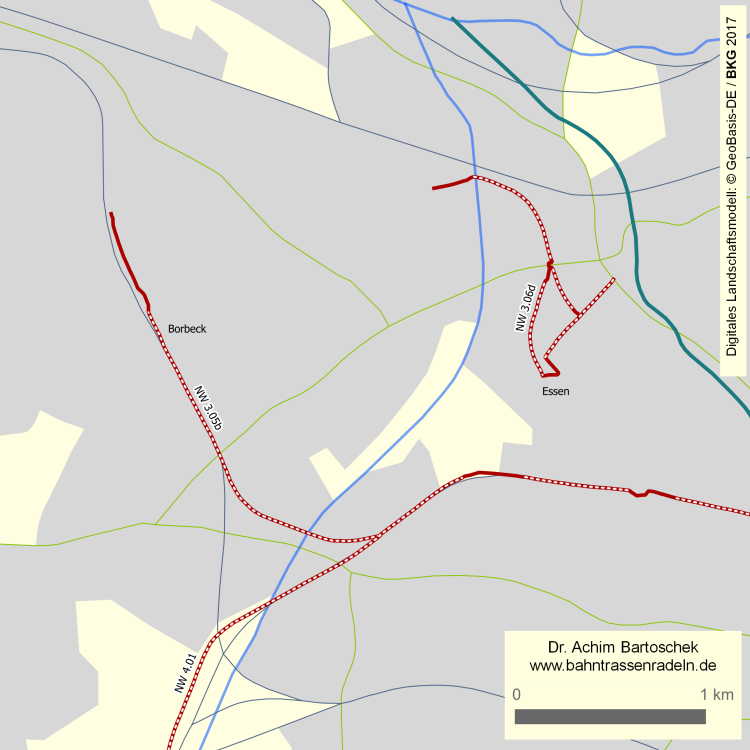 Radwegebau: | 2012/13 wurde der von der Rheinischen Bahn abzweigende 2 km lange Ast nach Essen-Borbeck durch den Regionalverband zu einem Radweg ausgebaut; Baubeginn war am 17.09.2012. 900 m der Trasse wurden dabei vom RVR erworben, der bahnparallele Abschnitt bleibt im Eigentum der Deutschen Bahn. |