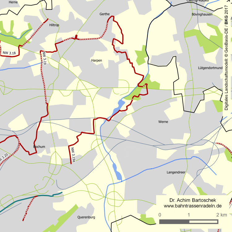 den Harpener Hellweg / K 6 queren (Pfostensperren und Querungshilfe) und wenig links versetzt folgen: Gef.; dem Weg mit Kurven folgen und bei 3,5 einen Bach überqueren; vor der BAB 40 Linkskurve, dann l. St.; ab der Linkskurve kurz auf einer ehem. Bahntrasse, dann rechts zur Straße |