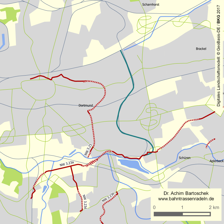 Die verkehrsarme Route auf der ehem. Verbindungskurve vom ehem. Dortmunder Ost- zum Südbahnhof und weiter auf dem äußersten Abschnitt der Rheinischen Bahn wurde am südlichen Ende verlängert und über einen neuen "Emschersteg" an das entstehende Wegesystem zum Phoenixsee angeschlossen. |