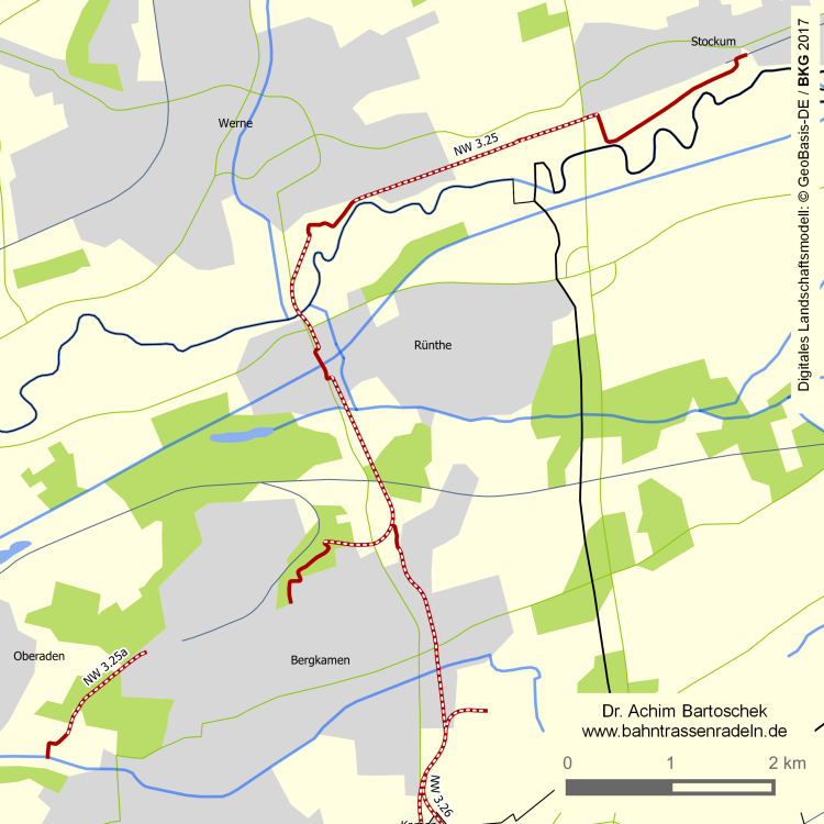 Verweise: | In Bergkamen wurde bis Ende Juni 2013 der 350 m lange Lückenschluss zum Klöcknerbahnweg (NW 3.26) inkl. einer Ampel an der Querung der Industriestraße ausgebaut. |